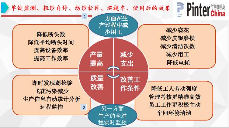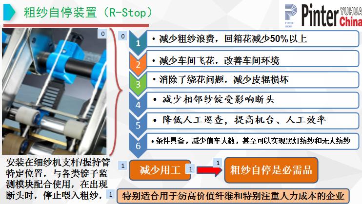 降低用工成本:監(jiān)測(cè)到斷頭可即時(shí)打斷粗紗,停止喂入,減少粗紗浪費(fèi)。由于即時(shí)停止粗紗喂入,減少回花,廢棉明顯降低。降低膠輥、皮圈和羅拉的維護(hù):粗紗自停裝置及時(shí)停止粗紗喂入,避免了纏繞,降低對(duì)膠輥、皮圈、羅拉的損害。減少擋車(chē)工及保全工,降低用工成本。