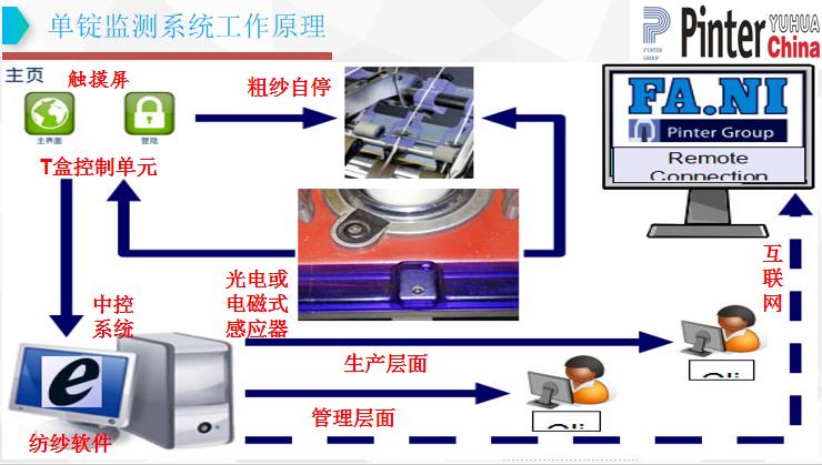 單錠監(jiān)測(cè)系統(tǒng),包含錠子監(jiān)測(cè)模塊、粗紗自停裝置、能耗模塊、牽伸模塊、效率模塊、照明控制模塊、T盒控制單元、中控系統(tǒng)等,其中每個(gè)模塊都包含監(jiān)測(cè)單元、執(zhí)行或顯示單元,用戶可根據(jù)需求選擇。尤里卡紡紗軟件,通過(guò)主服務(wù)器,收集、記錄各個(gè)子系統(tǒng)的實(shí)時(shí)數(shù)據(jù),并將數(shù)據(jù)進(jìn)行整理和分析后,分別提供給管理人員、操作人員和維護(hù)人員等。